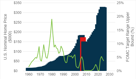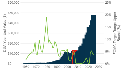The metrics shared in the articles looked at the Dow Jones Industrials, Nominal Home Prices and Consumer Credit from 1961 to 2006. The graphs below include that time and are extended through 2025.